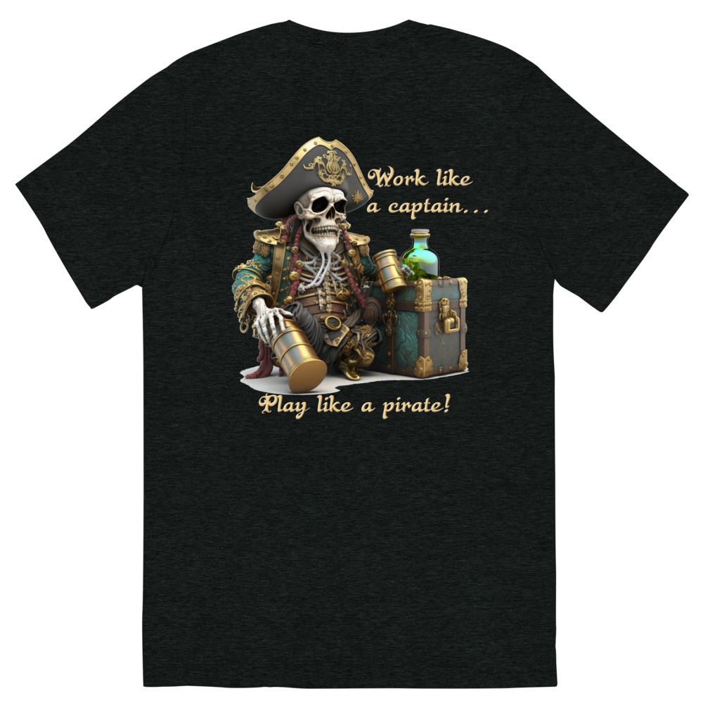 "Work Like a Captain, Play Like a Pirate" on a quality short-sleeve crew neck t-shirt